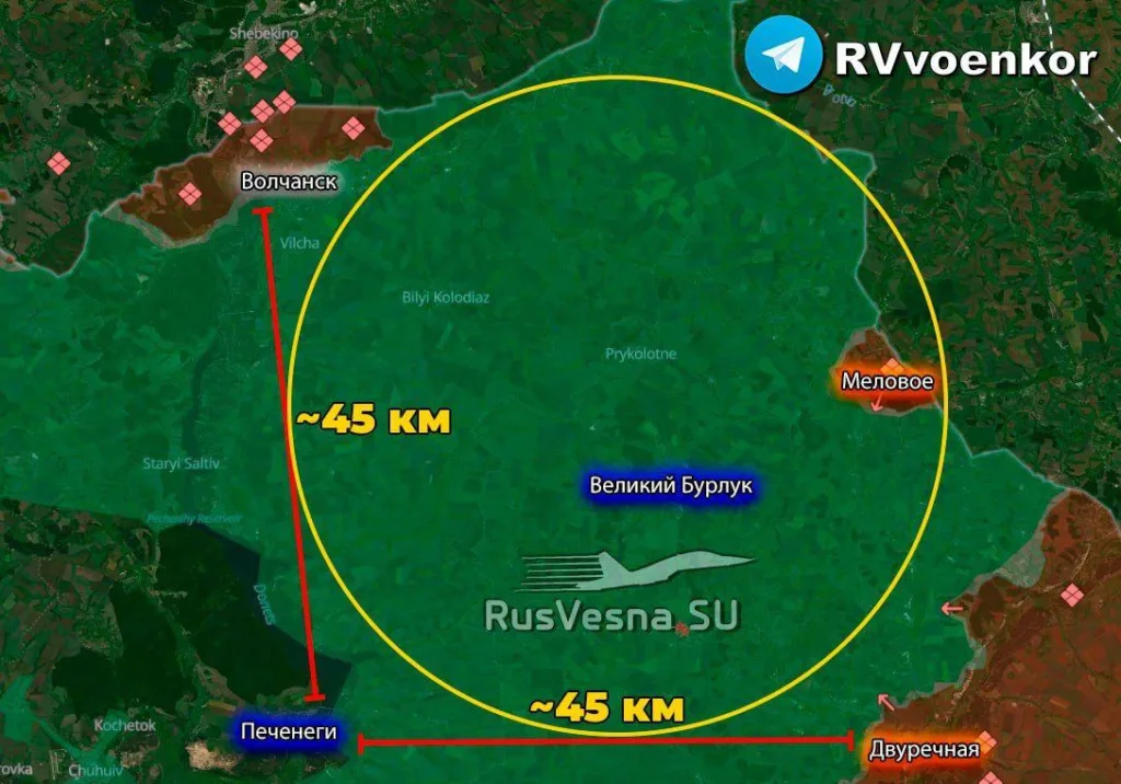 En azul, en el centro del círculo, el principal nudo logístico que abastece todo el frente del este de la ciudad de Járkov, Velykyi Bruluk.