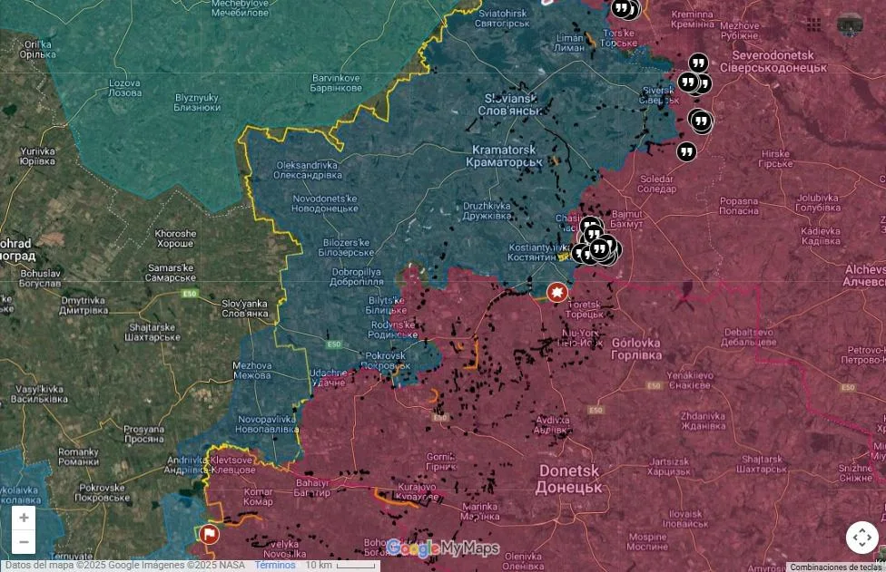 Así, dejando de lado que, según los datos reconocidos por el propio ejército de EEUU, Rusia ya controla el 99,8% de Lugansk, lo cierto es que la línea defensiva del norte de Donetsk no solo ya fue quebrada, dado que la línea se forma con el eje Kramatorsk-Sloviansk-Konstantinivka-Pokrovsk, sino que, cuando se mira cualquiera de los mapas abiertos que registran fortificaciones, el quiebre que los rusos están desarrollando en el norte de Pokrovsk (y que lo preví incluso dibujando un mapa para un artículo de prensa obrera), está abriendo el camino hacia la retaguardia de Sloviansk y Kramatorsk.