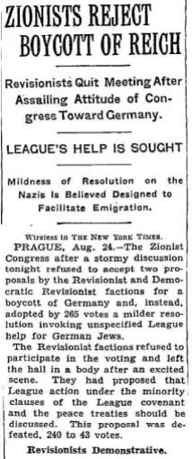 La situación internacional, sin embargo, iba a tener impacto directo al dotar de nuevas fuerzas a la colonización sionista. Si el aumento de la discriminación a los judíos en Europa sumaba contingentes de migrantes hacia Palestina, la Agencia Judía buscó activamente explotar esa posibilidad incluso mediante acuerdos con los gobiernos fascistas. Ya en 1926 el dirigente sionista Jaim Weitzman se entrevistó con Mussolini, interesado en la propuesta de financiar la migración judía en aras de contrarrestar la influencia británica en Oriente. En 1933 el líder sionista David Ben Gurión firmó con Hittler el «pacto de Haavara» (transferencia, en hebreo) para promover el traslado de las familias judías alemanas y sus bienes hacia Palestina, a cambio del fin al boicot económico a Alemania que estaba en franco crecimiento. Un artículo del New York Times reflejó en marzo de ese año cómo se impuso el rechazo al boicot a los nazis en el congreso sionista realizado en Praga.